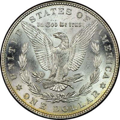 The back side of the Morgan Dollar (tails), known as the reverse, features an eagle with wings outspread with the motto, IN GOD WE TRUST above. Encircling the coin above is UNITED STATES OF AMERICA with the denomination, ONE DOLLAR, with stars on either side.