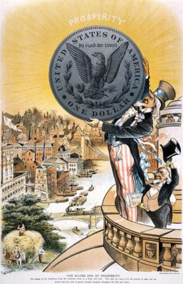 The Comstock Lode in 1859 upset the 16:1 gold to silver ratio. Silver prices lowered which resulted in a flood of silver dollars causing the gold standard to be endangered. Britain wanted to increase control of America’s money supply and a British banker was given 5 million dollars to bribe congress to demonetize silver.