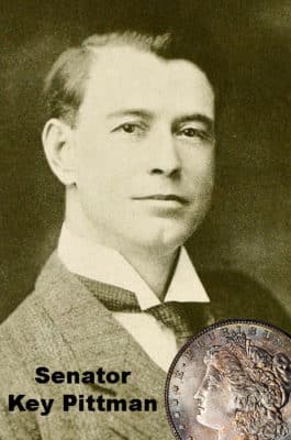 The Pittman Act in 1918 a solution that was a federal law sponsored by Senator Key Pittman of Nevada. The act authorized the conversion of not exceeding 350,000,000 standard silver dollars into bullion to help pay for wartime efforts and conserve the gold supply. This resulted in melting over 270 million Morgan dollars for sale of bullion overseas to buy bullion from mining companies at above-market rates.