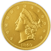 The discovery of gold at Sutter’s Mill in 1848 prompted Congress to demand that U.S. gold coinage be expanded. The March 3, 1849 Act authorized not only the first and well-known $20 gold pieces but also the first gold dollars, thereby creating the nation’s smallest and largest regular-issue gold coins in one fell swoop. The designer of both new coins was U.S. Mint Chief Engraver, James Barton Longacre. Both had a similar obverse design of a left-facing portrait of Miss Liberty with a coronet crown in her hair. The Dollar Liberty head is encircled by 13 stars, symbolizing the 13 original colonies, as does the twenty, but the famed Double Eagle features the date on the obverse.