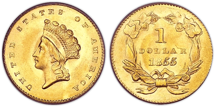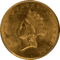 In light of its small 13mm size, the reverse bears the denomination “1 DOLLAR” and the date within a simple wreath, which is encircled by the inscription, UNITED STATES OF AMERICA. The initial design remained in use until 1854, when a feather headdress replaced the coronet, which type is generally referred to as the Indian Head or Princess. In 1856 the type was changed slightly by enlarging the size of the head. Thus, there are three distinct types of gold dollars, but they are generally collected as one 81-coin series, including major varieties.