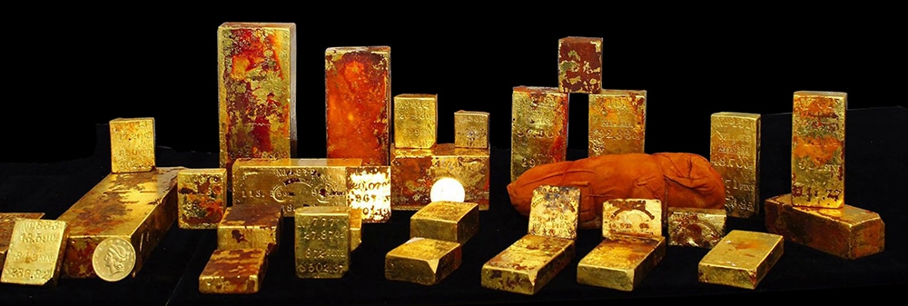 The display of recovered California Gold Rush treasures from the 1857 sinking of the fabled S.S. Central America will feature gold coins, assayer’s ingots, gold nuggets, and gold dust.