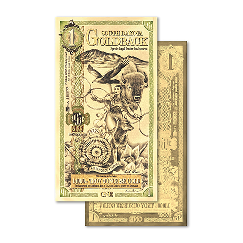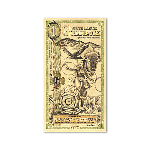The 1 South Dakota Goldback introduces Pax—Latin for Peace—in her first appearance within the Goldback series. Embodied as a Lakota Native American woman adorned in traditional regalia, she is captured mid-performance in a hoop dance, a sacred and expressive art form demonstrated personally to the artist during a research visit to South Dakota. The regalia she wears is self-made, infused with the essence of her name, lineage, tribe, and personal story—a tapestry of cultural heritage and individual passion.