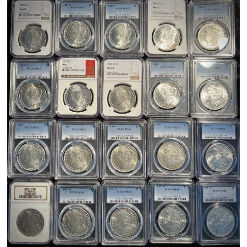 ✅ 20 different Morgan Silver Dollars (MS63 grade)