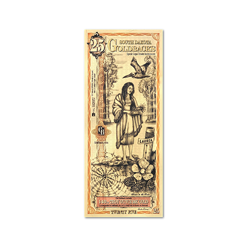 The 25 South Dakota Goldback features the first portrayal of Laurea—Latin for Honor—capturing the timeless value of fidelity, virtue, and steadfastness. Her depiction is steeped in local legend, drawing inspiration from the story of Minnecotah, a young woman whose tale is intimately connected with Maiden’s Isle on Lake Kampeska, one of South Dakota’s glacial lakes.