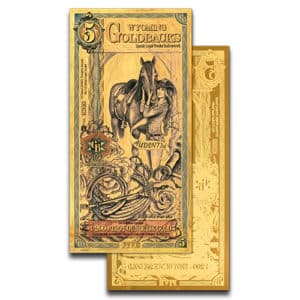 The 5 Wyoming Goldback introduces Audentia—Latin for Boldness—in her inaugural portrayal within the Wyoming series. She appears as a poised rodeo queen, newly crowned and adorned in formal performance attire, embodying both the elegance and fearless determination of the American West. Her trusted horse stands loyally at her side, reinforcing the theme of partnership and resolve.