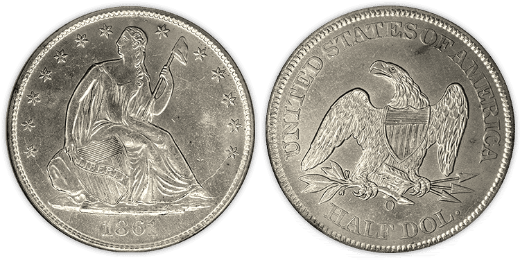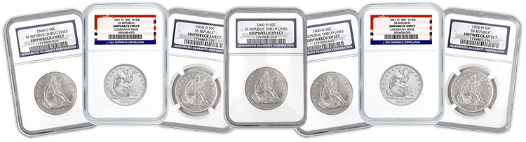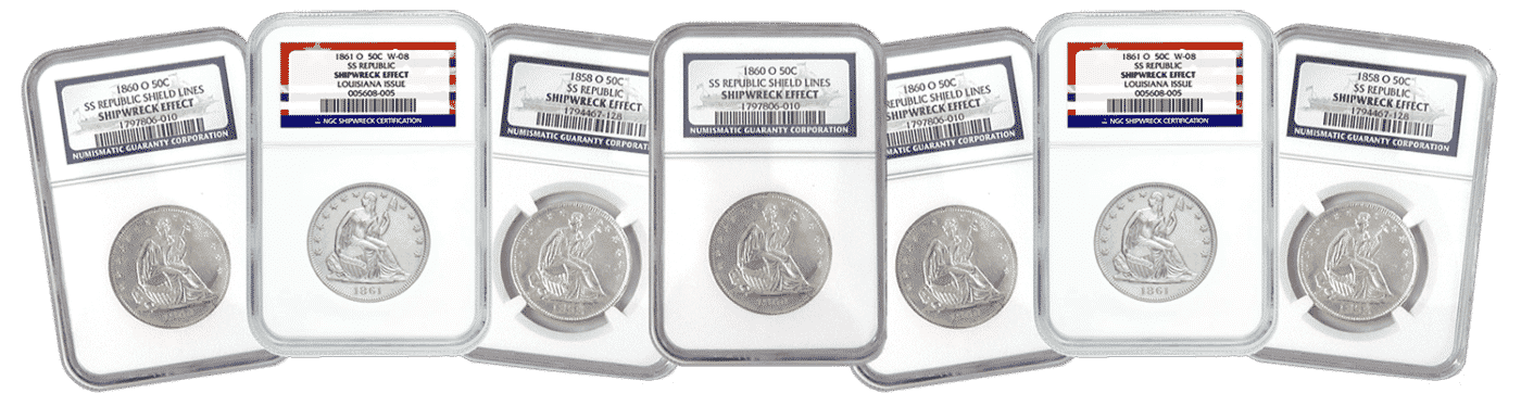 A total of seven NGC-certified “Shipwreck Effect” Seated Liberty Half-Dollars, all different dates (dates our choice), struck between 1846 and 1861 at the New Orleans Mint, recovered from the 1865 shipwreck of the SS Republic. Also includes Bonus Package (see below).