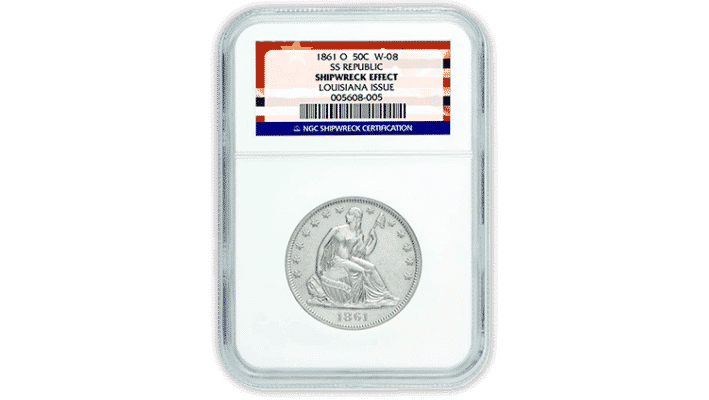 A single NGC-certified “Shipwreck Effect” Seated Liberty Half-Dollar – struck prior to 1861 at the New Orleans Mint, recovered from the 1865 shipwreck of the SS Republic. Also includes Bonus Package (see below).