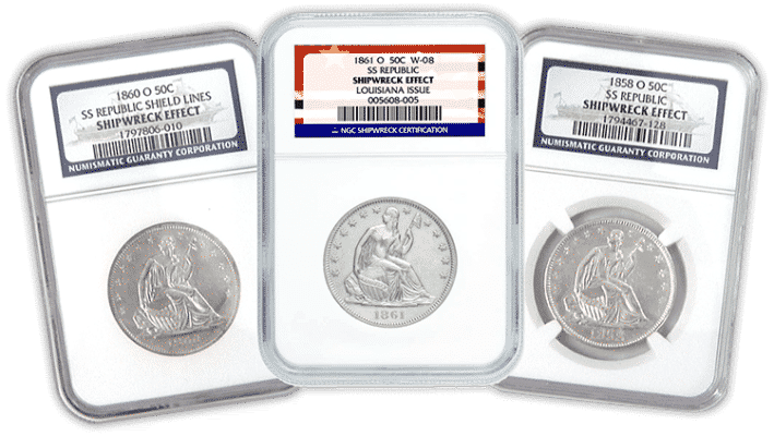 A total of three NGC-certified “Shipwreck Effect” Seated Liberty Half-Dollars, all different dates (dates our choice), struck between 1846 and 1861 at the New Orleans Mint, recovered from the 1865 shipwreck of the SS Republic. Also includes Bonus Package (see below).