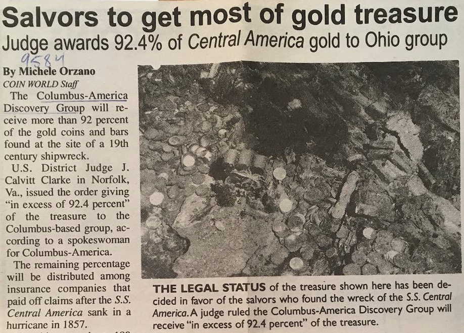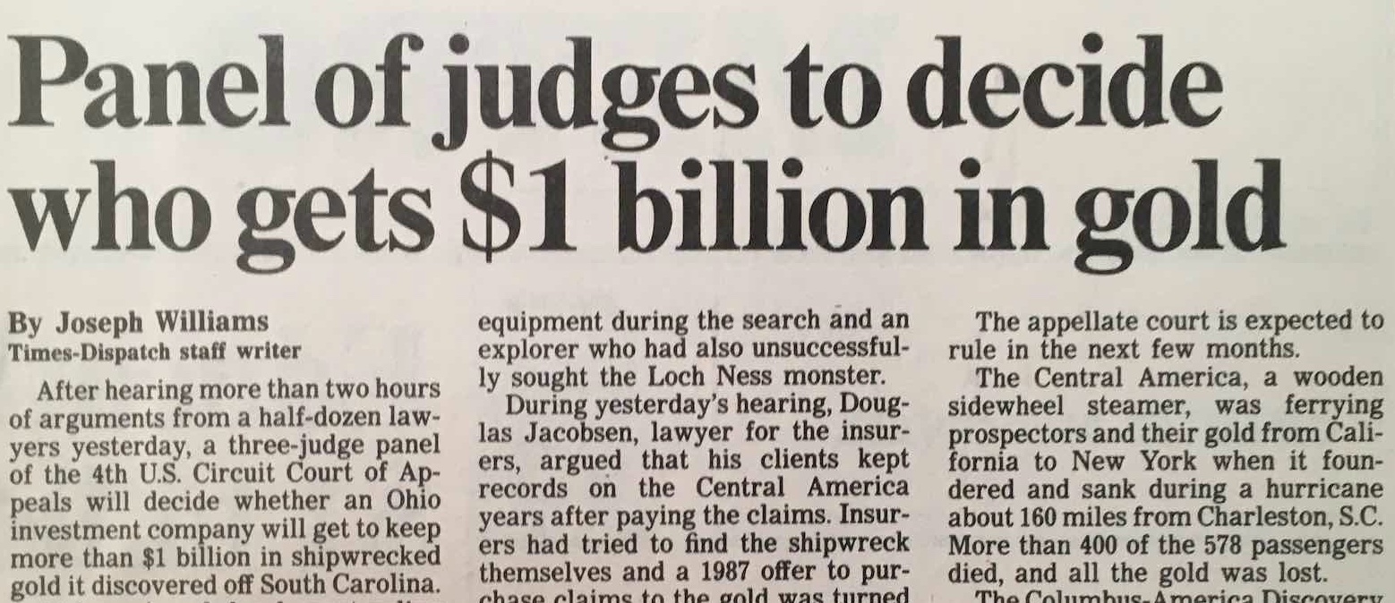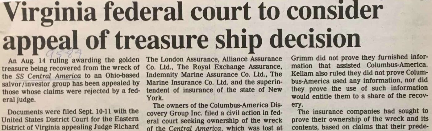 The other two matters were the topics of dispute during the trial before Judge Kellam in April, 1990: ownership, and abandonment. It was the underwriters’ contention that they were the subrogated owners of the treasure, for which they had paid claims to those shipping it, following the sinking in 1857. The evidence that contemporary newspapers said that claims would be paid (strategically announced to forestall the effects of the Panic of 1857), as well as a scrapbook of newspaper excerpts maintained by one insurer, and noting the loss of with a clipping and cryptic marginalia, was not enough to convince the Court that the owners had not abandoned their gold shipment.