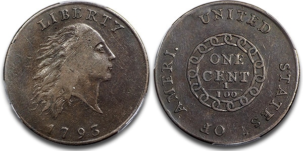 1793 Flowing Hair Cent, Chain Reverse AMERI, graded VF-30 by PCGS, realized $52,800.