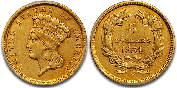 1854-D three-dollar gold piece graded AU-50 by PCGS realized $52,800.