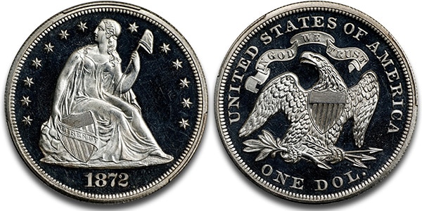 1872 Proof Liberty Seated silver dollar graded Proof-65+ Deep Cameo (PCGS) CAC, more than doubled the previous record at $40,800.