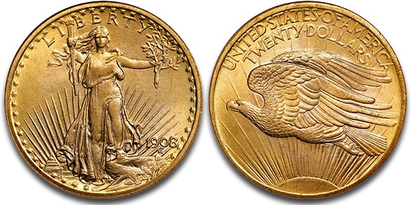 1908 Saint-Gaudens Double Eagle No Motto, from the Wells Fargo Hoard, graded MS-68 by NGC realized $16,200.